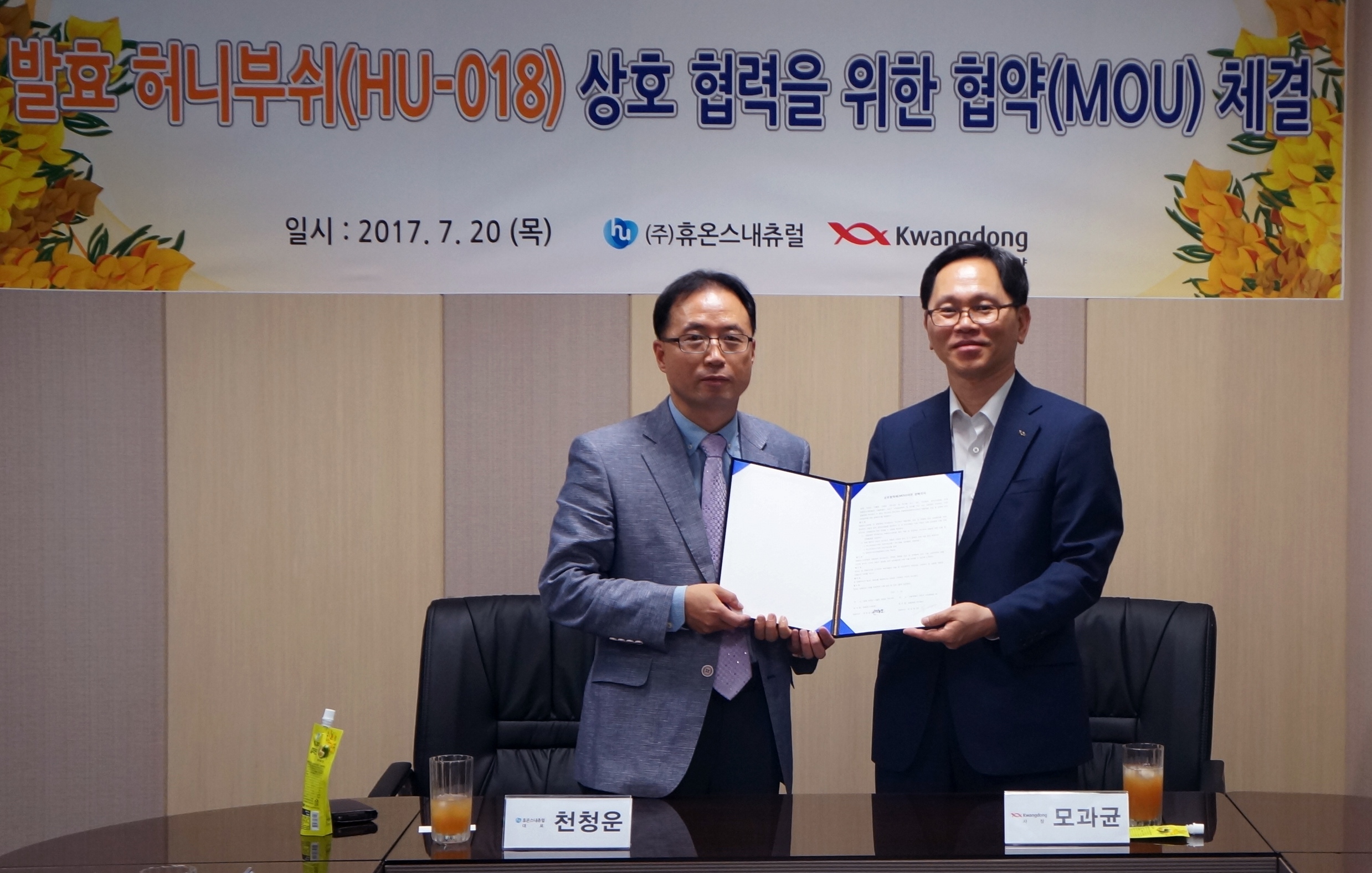 이와 관련, 휴온스내츄럴은 20일 광동제약과 ‘발효허니부쉬’ 완제품의 개발 유통채널(홈쇼핑, 대리점 외)에 관한 상호 협력 MOU를 맺고, 현재까지 개발 완료된 ‘발효허니부쉬’ 건강기능식품 외에 액상차를 비롯한 다양한 응용제품 개발 및 유통에 양사가 협력키로 했다.