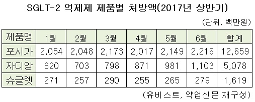 2016년 상반기 포시가·자디앙·슈글렛의 총 처방액 112억원에서 1년 후인 2017년 같은 분기 총 처방액이 80억원 늘어난 193억을 기록했는데, 이 같은 성장세가 유지되면 2017년 연 처방액은 400억 가까이 늘어날 것으로 보인다.
