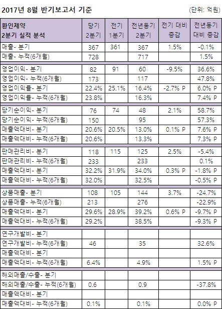 환인제약은 ‘2017년 8월 반기보고서 기준’ 상반기 728억원의 매출을 달성, 전년동기대비 1.5% 성장했다(2분기=367억, 전년동기대비 0.1% 감소)