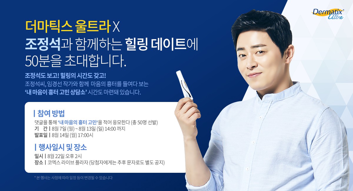 배우 조정석과 함께 하는 이번 힐링 데이트에 참여하기 위해서는 7일부터 13일까지 오후 2시까지 더마틱스 울트라 공식 페이스북에서 진행되는 이벤트에 댓글을 달아 응모할 수 있다. 댓글의 주제는 ‘내 마음의 흉터 고민’이며, 사연이 선정된 4명을 포함, 추첨을 통해 총50명을 초대한다.