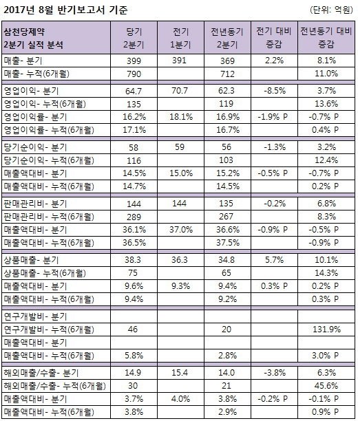 삼천당제약은 '2017년 반기보고서 기준' 상반기 790억원의 매출을 달성, 전년동기대비 11.0% 성장했다.