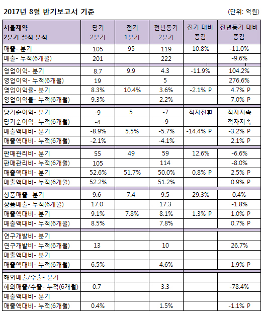 서울제약은 '2017년 8월 반기보고서 기준' 상반기 201억원의 매출을 달성, 전년동기대비 9.6% 감소했다.