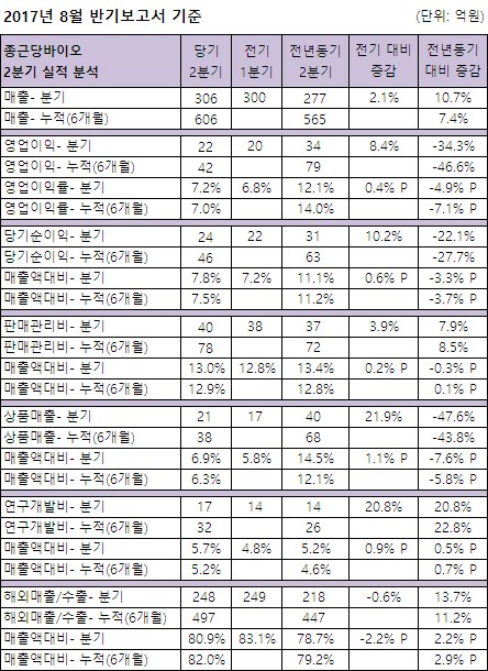 종근당바이오는 '2017년 8월 반기보고서 기준' 상반기 606억원의 매출을 달성, 전년동기대비 7.4% 성장했다.