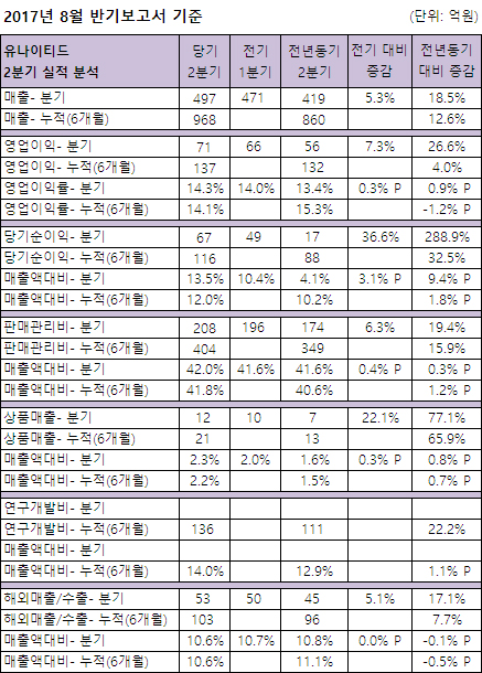 한귝유나이티드제약은 '2017년 8월 분기보고서 기준' 상반기 968억원의 매출을 달성, 전년동기대비 12.6% 성쟁했다.