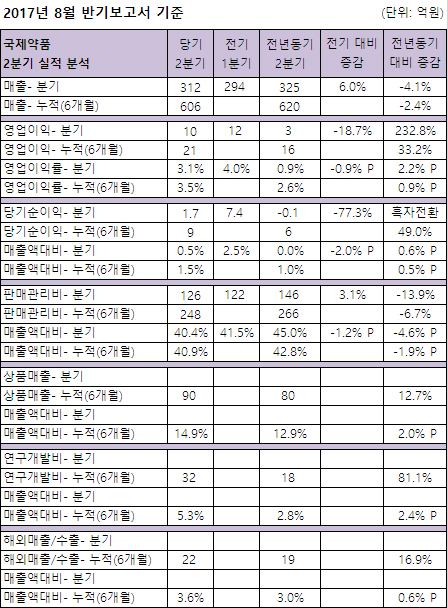 국제약품은 '2017년 8월 반기보고서 기준' 상반기 606억원의 매출을 달성, 전년동기대비 2.4% 감소했다.