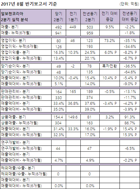 알보젠코리아는 '2017년 8월 반기보고서 기준' 상반기 941억원의 매출을 달성, 전년동기대비 1.8% 하락했다.