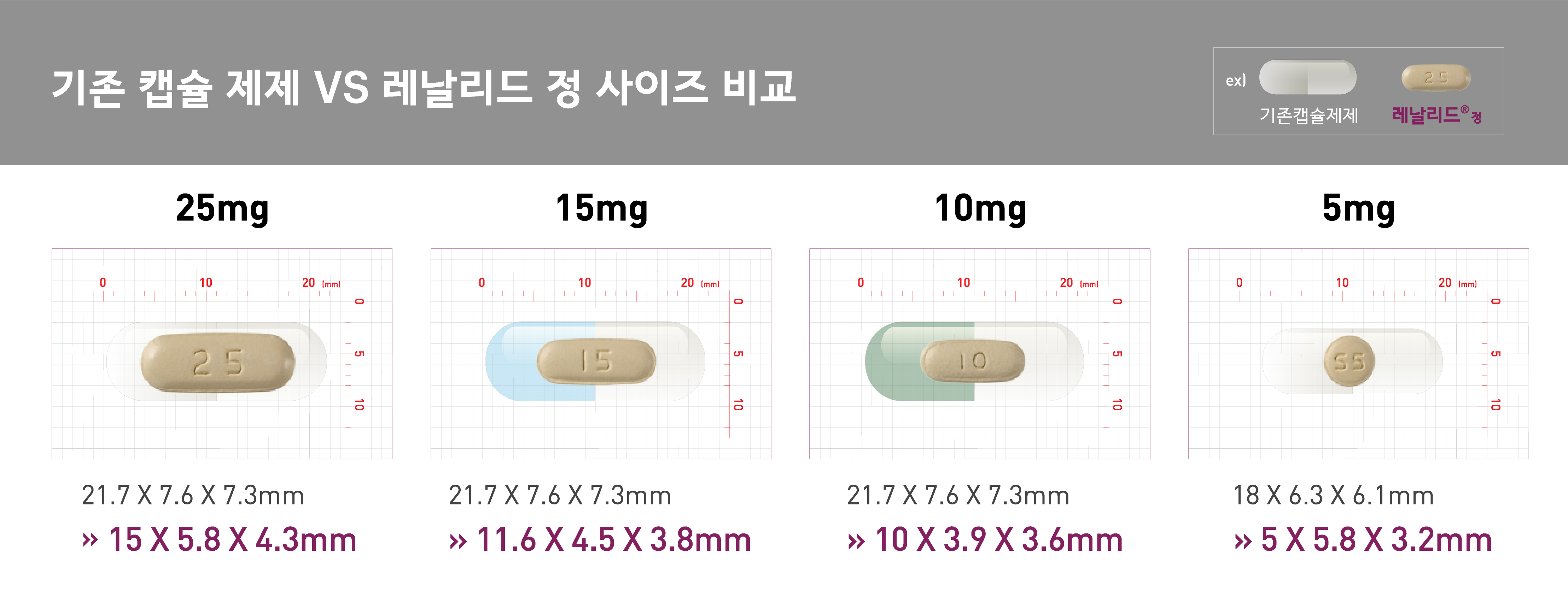 삼양바이오팜의 레날리드 정은 ‘세엘진코리아’에서 판매하는 ‘레블리미드 캡슐’의 제네릭이다. 기존 캡슐 제품과 비교해 약 1/3 수준(25mg기준)으로 부피를 줄여 복약편의성을 높였다. 고령의 환자들이 캡슐 복용 시 흔히 호소하는 입안, 식도 점막에 캡슐이 달라붙는 불편도 정제로 만들어 원천적으로 차단했다.