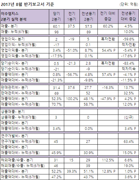 이수앱지스는 '2017년 8월 반기보고서 기준' 상반기 98억원의 매출을 달성, 전년동기대비 10.0% 성장했다.