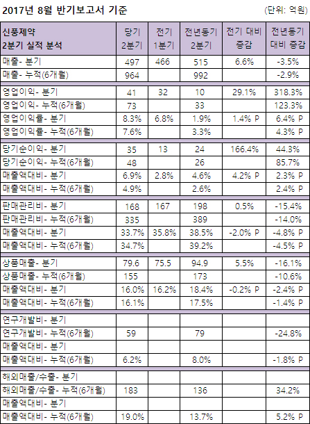 신풍제약은 '2017년 8월 반기보고서 기준' 상반기 964억원의 매출을 달성, 전년동기대비 2.9% 감소했다.