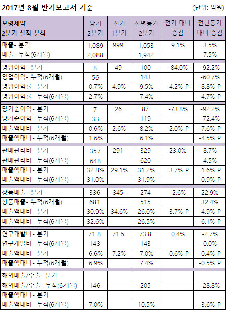 보령제약은 '2017년 8월 반기보고서 기준' 상반기 2,088억원의 매출을 달성, 전년동기대비 7.5% 성장했다.