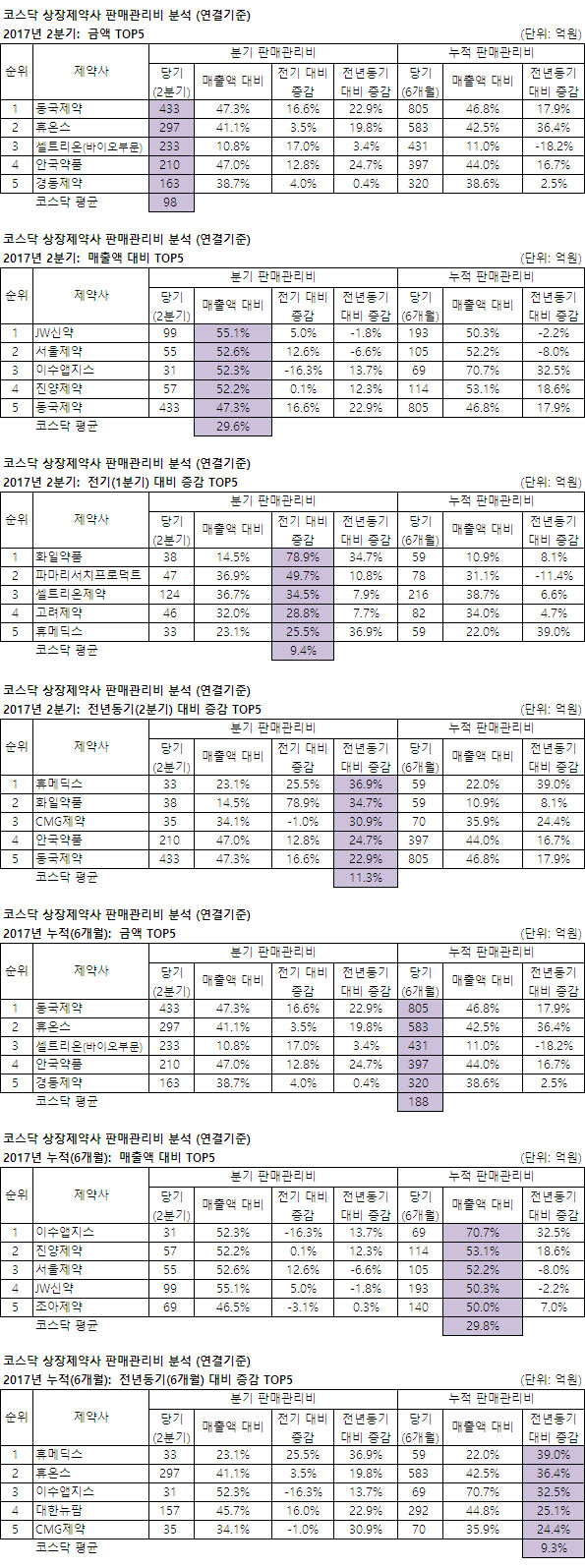 제약사별(2분기): 전기비=화일약품은 17억 증가(대손상각비 17억 증가), 파마리서치프로덕트는 16억 증가(경상개발비 11억 증가), 셀트리온제약은 32억 증가(판매수수료 13억 증가, 광고선전비 6억 증가), 고려제약은 10억 증가(급여 복리후생 7억 증가), 휴메딕스는 7억 증가(급여 복리후생 3억 증가)했다.