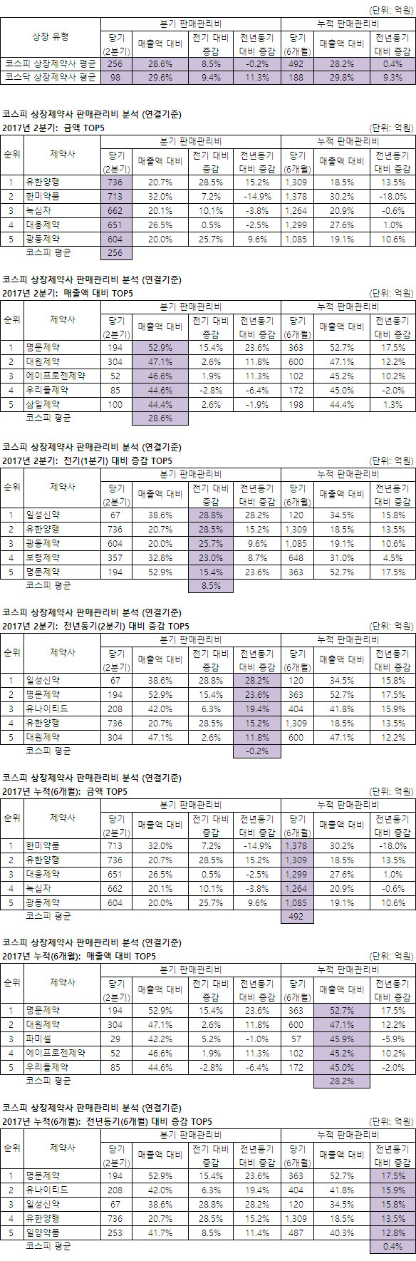 메출액대비 판관비는 2분기 '톱5'중 5위인 삼일제약이 빠지고 파미셀이 3위에 들었다. 명문제약이 50%를 넘은 가운데, '톱5' 모두 45%를 넘었다(평균 28.2%)