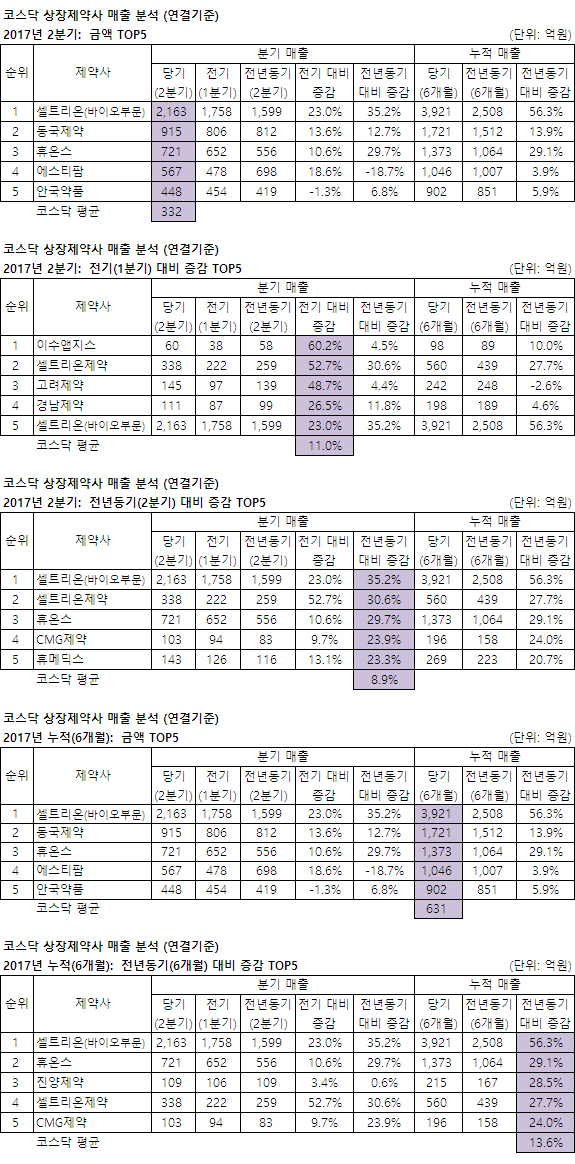 전년동기대비 증감률은 셀트리온(바이오부문)과 셀트리온제약이 30%를 넘으며 1,2위를 차지했고, 휴온스 CMG제약 휴메딕스가 20%를 넘으며 '톱5'에 합류했다(평균 8.9%)