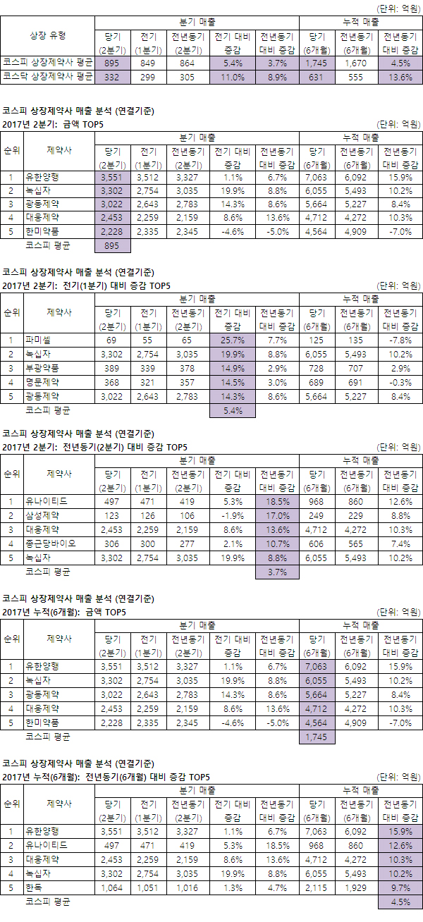 매출액은 코스피는 유한양행 코스닥은 셀트리온(바이오부문)이 가장 많았고 전년동기대비 증감률도 코스피는 유한양행 코스닥은 셀트리온(바이오부문)이 가장 높았다.