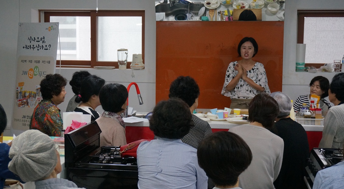 이날 행사에는 용산여성인력개발센터 이상옥 조리강사가 저단백, 저염 식이요법에 대한 강의와 함께 ‘JW안심푸드’를 활용한 실제 조리 과정을 선보여 참가자들로부터 높은 호응을 얻었다. JW안심푸드는 단백질, 나트륨, 칼륨, 인 등의 함량을 기술적으로 줄인 제품으로 즉석식품을 비롯해 면류, 밥, 소스, 에너지 보충식품 등으로 구성됐다.