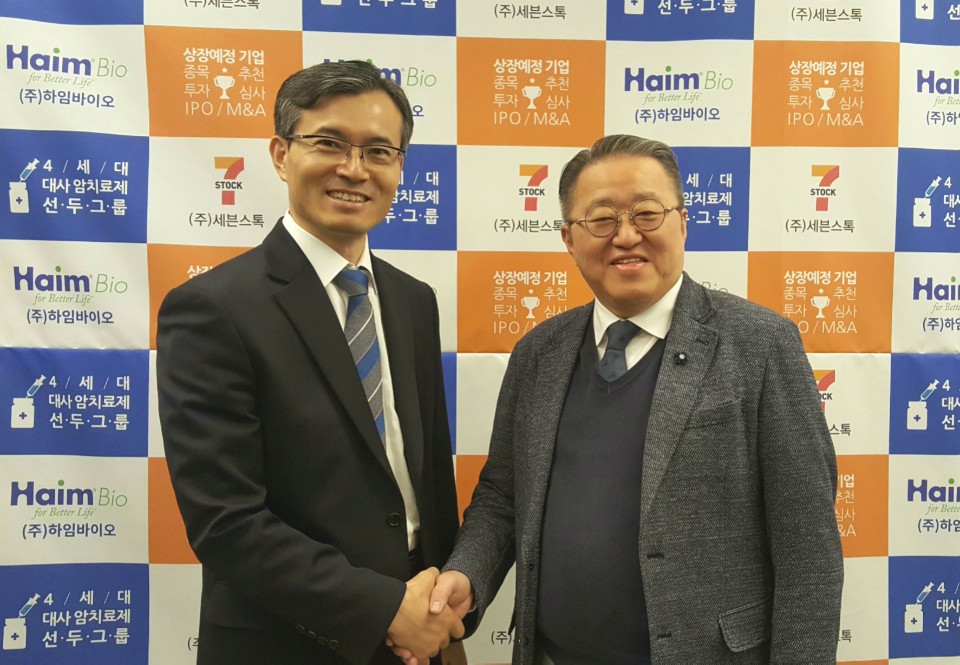 ㈜세븐스톡(대표 송영봉)이 바이오 벤처기업 ㈜하임바이오(대표 김홍렬)와 투자유치와 상장준비(IPO)를 위한 정식 계약을 체결하고 1천4백억 달러(한화 160조원) 규모인 ‘대사 항암치료제’ 세계시장 선점을 위한 본격적인 활동에 나선다고 18일 공식 발표했다.
