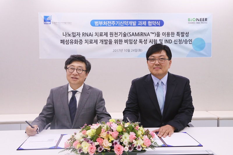 '㈜바이오니아(대표이사 박한오)가 원천특허를 보유하고 있는 차세대 신약기반기술 SAMiRNA'를 이용한 특발성 폐섬유화증(idiopathic pulmonary fibrosis, IPF) 치료제 신약개발 프로젝트가 ‘범부처전주기신약개발사업’ 과제로 선정돼 24일 (재)범부처신약개발사업단(단장 묵현상)과 협약을 체결했다.