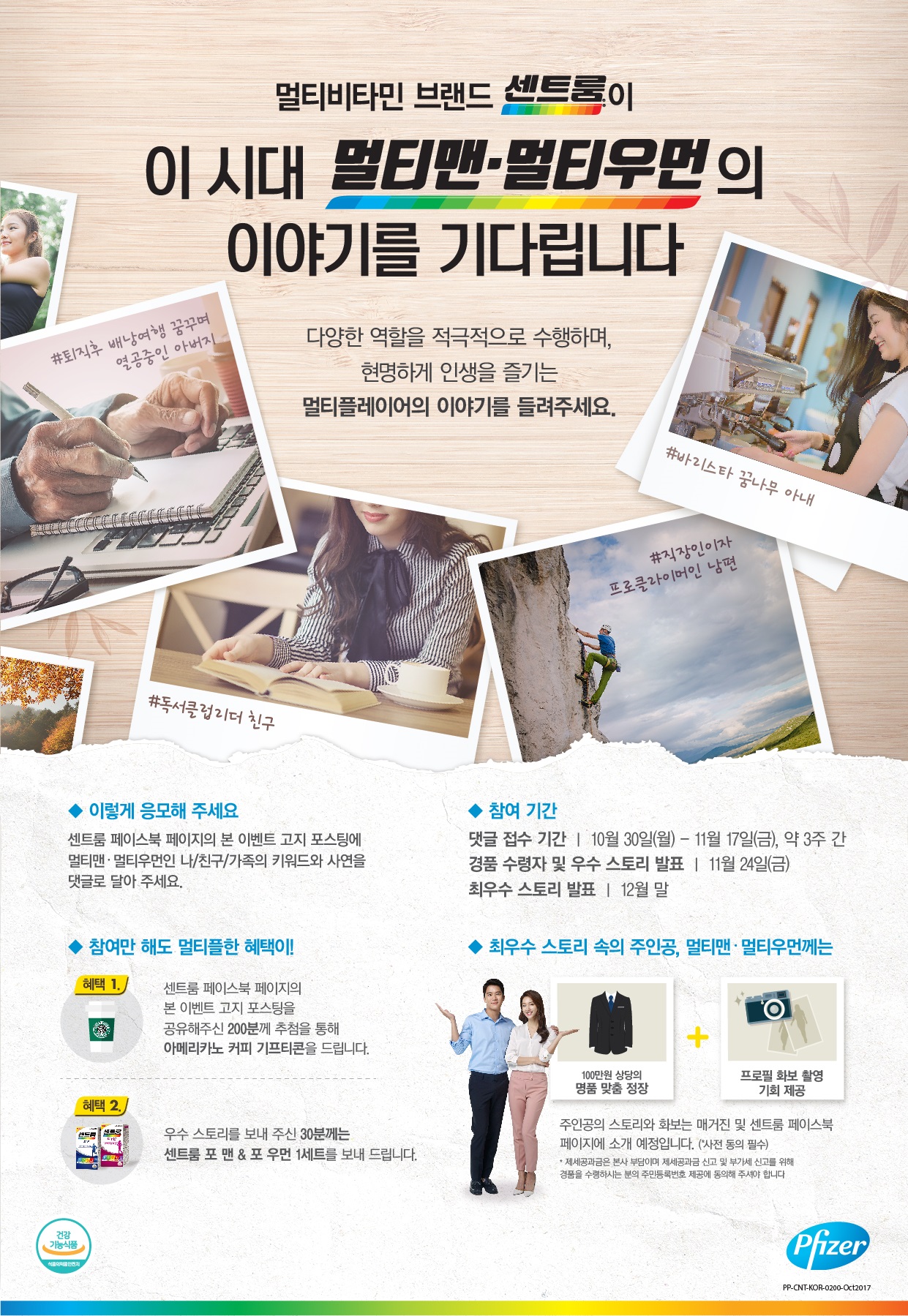 한국화이자제약(대표이사 사장 오동욱, www.pfizer.co.kr)은 11월 17일까지 약 3주간 센트룸 페이스북 페이지에서 “멀티맨·멀티우먼 스토리 공모 이벤트”를 진행한다고 밝혔다.