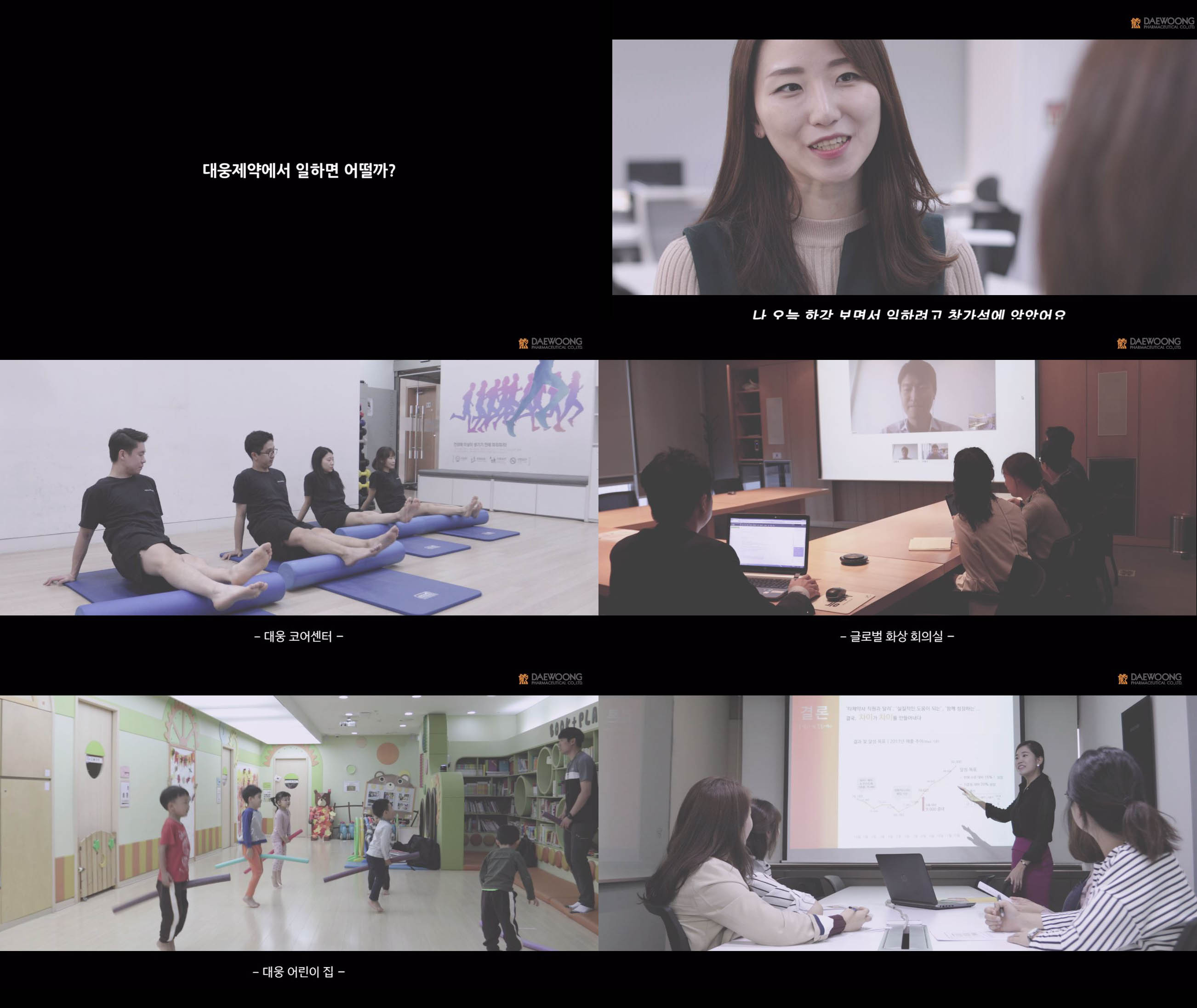 영상에서 대웅제약 직원들은 나이.성별.근무연한.국적 상관없이 역량만 있으면 본인이 가장 잘 할 수 있는 직무에 스스로 도전하고 선택 할 수 있는 직무급제도, 자율성과 몰입을 통해 업무효율을 높이는 혁신형 사무공간인 스마트오피스, 다양한 업무에 도전할 수 있는 경력개발프로그램 CDP, 시간과 공간의 제약없이 일할 수 있는 기회를 제공하는 유연근무제와 화상세미나 프로그램 등 대웅제약만의 자율적인 근무 제도를 소개했다.