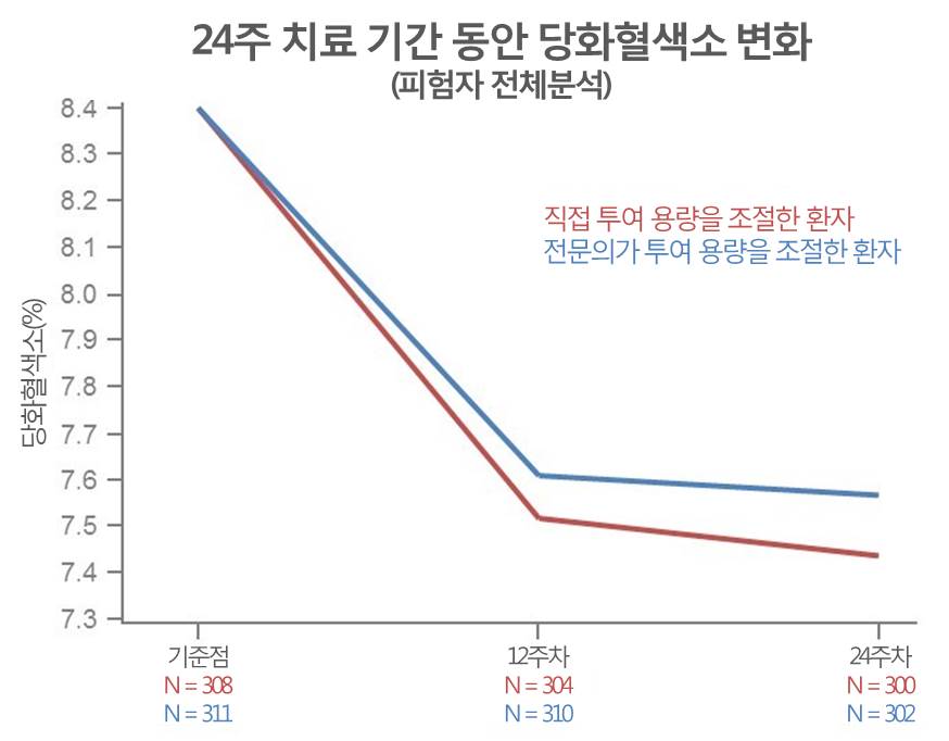 해당 임상 연구는 24주 간 당화혈색소의 변화 추이를 측정해, 환자가 직접 투여 용량을 조절하거나 전문의가 투여 용량을 조절했을 때 나타나는 혈당 조절 측면에서의 비열등성을 입증하기 위해 진행됐다.