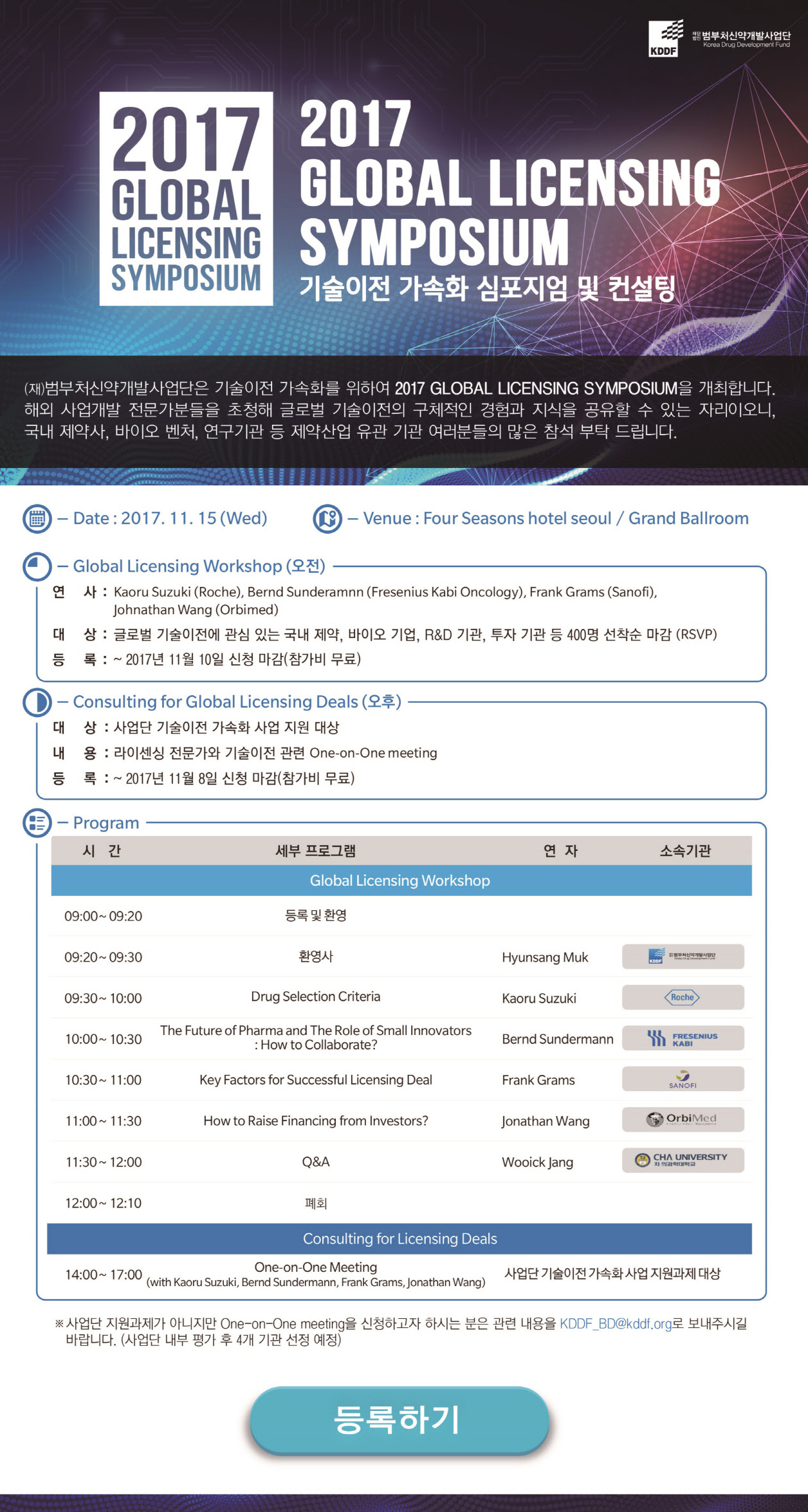 묵현상 범부처신약개발사업단장은 “기술이전 가속화 심포지엄 및 2017 R&D 워크숍을 통해 경쟁력을 갖춘 국내 연구 성과들이 글로벌 신약으로 도약할 수 있는 기회를 제공하고자 한다”며, “이번 행사가 성공적인 글로벌 기술이전을 위한 정보 공유 및 협력의 장이 될 수 있도록 적극적인 참여와 관심을 부탁드린다”고 말했다.