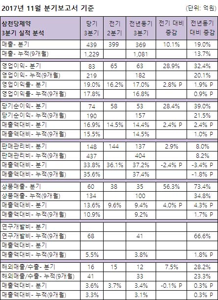 삼천당제약은 11월 분기보고서 기준 3분기 439억원의 매출을 달성, 전년동기대비 19.0% 성장했다.