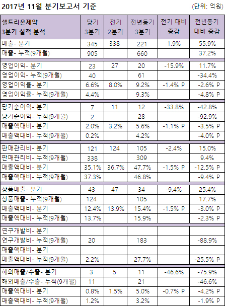 셀트리온제약은 11월 분기보고서 기준 3분기 345억원의 매출을 달성, 전년동기대비 55.9% 성장했다.
