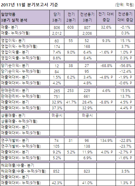 일양약품은 11월 분기보고서 기준 3분기 806억원의 매출을 달성, 전년동기대비 0.1% 감소했다.