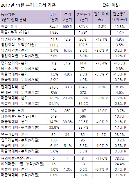 동화약품은 11월 분기보고서 기준 3분기 644.3억원의 매출을 달성, 전년동기대비 12.3% 성장했다.