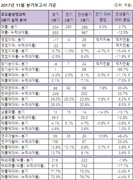 3분기 영업이익은 전기비 15억 감소(적자지속=바이오사업 10억 감소), 전년비 46억 감소(적자전환=의약사업 20억 감소, 바이오사업 14억 감소)했고, 누적 영업이익은 전년비 112억 감소(적자전환=환경사업 46억 감소, 의약사업 40억 감소)했다.