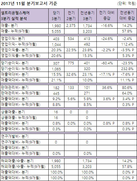 셀트리온헬스케어(2017년 7월 신규상장)는 11월 분기보고서 기준 3분기 1,980억원의 매출을 달성, 전년동기대비 14.2% 성장했다.