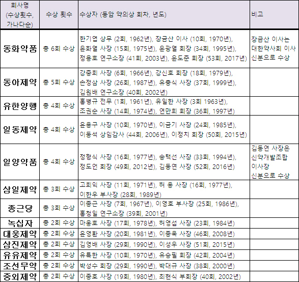 또 1961년 제정된 이후 53회까지 5개 제약사가 ‘부자 수상’을 했고, 한 개 제약사는 한 집안에서 3명이 수상한 것으로 나타났다.