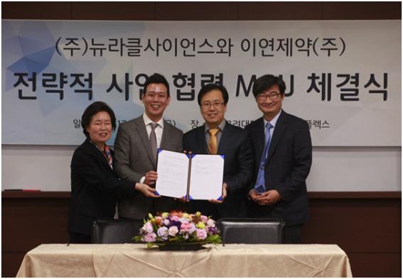 이연제약(대표이사 정순옥, 유용환)은 12월1일 고려대학교 자연계캠퍼스 산학관에서 (주)뉴라클사이언스(대표이사 김봉철)와 포괄적 업무 협조를 위한 MOU를 체결했다.