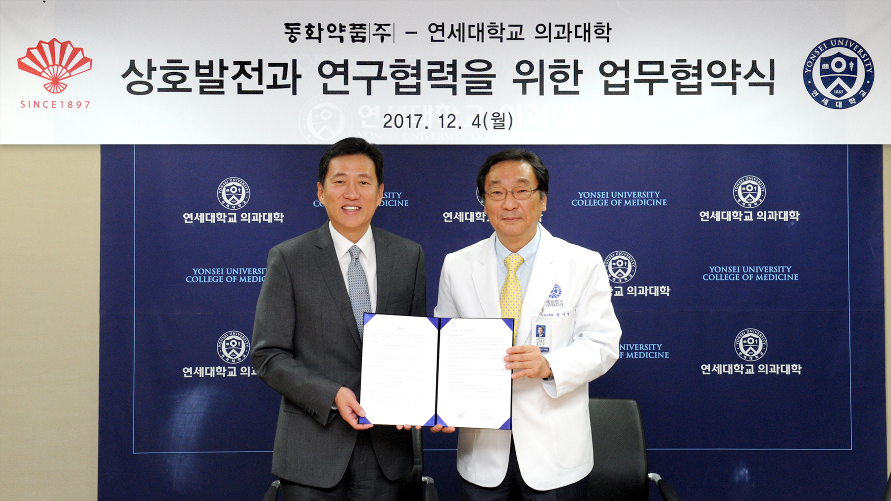 연세대 의과대학 대회의실에서 열린 이번 MOU는 우리나라 최초로 근대의학을 받아들여 의학발전과 의료기술을 선도해온 연세대 의과대학과 국내 최초 제약회사인 동화약품이 상호간 풍부한 연구경험과 노하우를 공유하고 미래지향적 협력관계를 구축해 의료 및 제약산업 경쟁력 제고 및 상호 발전에 기여하고자 체결됐다.
