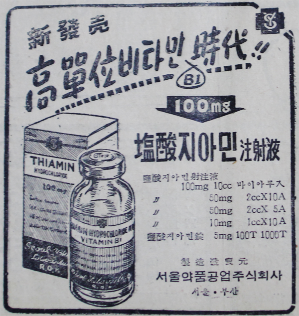 서울약품 고단위 염산 지아민 주사제(액) 광고.  종합비타민 제품이 선보이기 이전에는 이런형태의 수입산 수액 비타민제품들이 주종을 이뤘다.  비타민은 생리활성에 도움을 주는 필수 요소로서 발견된 순서와 효능에 따라 A, B, C 등으로 이름이 붙었다.