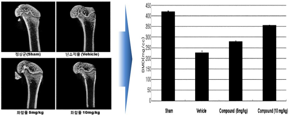 이어 난소적출 후 골 소실이 유발된 마우스 모델에 콜포신 화합물을 경구로 각 5㎎/㎏ 와 10㎎/㎏로 농도를 다르게 해 4주간 1일 1회 투여했다. 그리고 그 효과를 생체용 고화질 미세전산 단층 촬영 시스템으로 촬영 후 분석했다. 실험 결과 난소적출에 의해 감소된 골밀도가 콜포신 투여 4주 후 뚜렷하게 증가했다.
