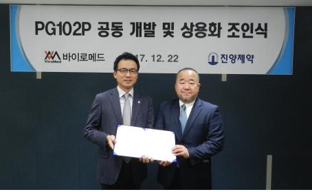 이번 계약을 통해 진양제약은 투석환자의 소양증 개선을 위한 PG102P의 국내 판매 및 제조 등 독점실시권을 갖게 되며, 바이로메드는 진양제약이 국내 소양증 개선용 제품으로 판매할 경우 원료를 독점적으로 공급하고 소양증 개선 제품을 위한 인체시험을 담당할 예정이다.