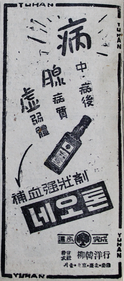 유한양행 네오톤 광고. 1954년 초부터 유한양행이 시리즈 형태의 세로광고를 전문지를 비롯 일간신문에 계속해서 내 보낸 네오톤은 보혈강장제라는 점을 집중적으로 강조하고 있다.