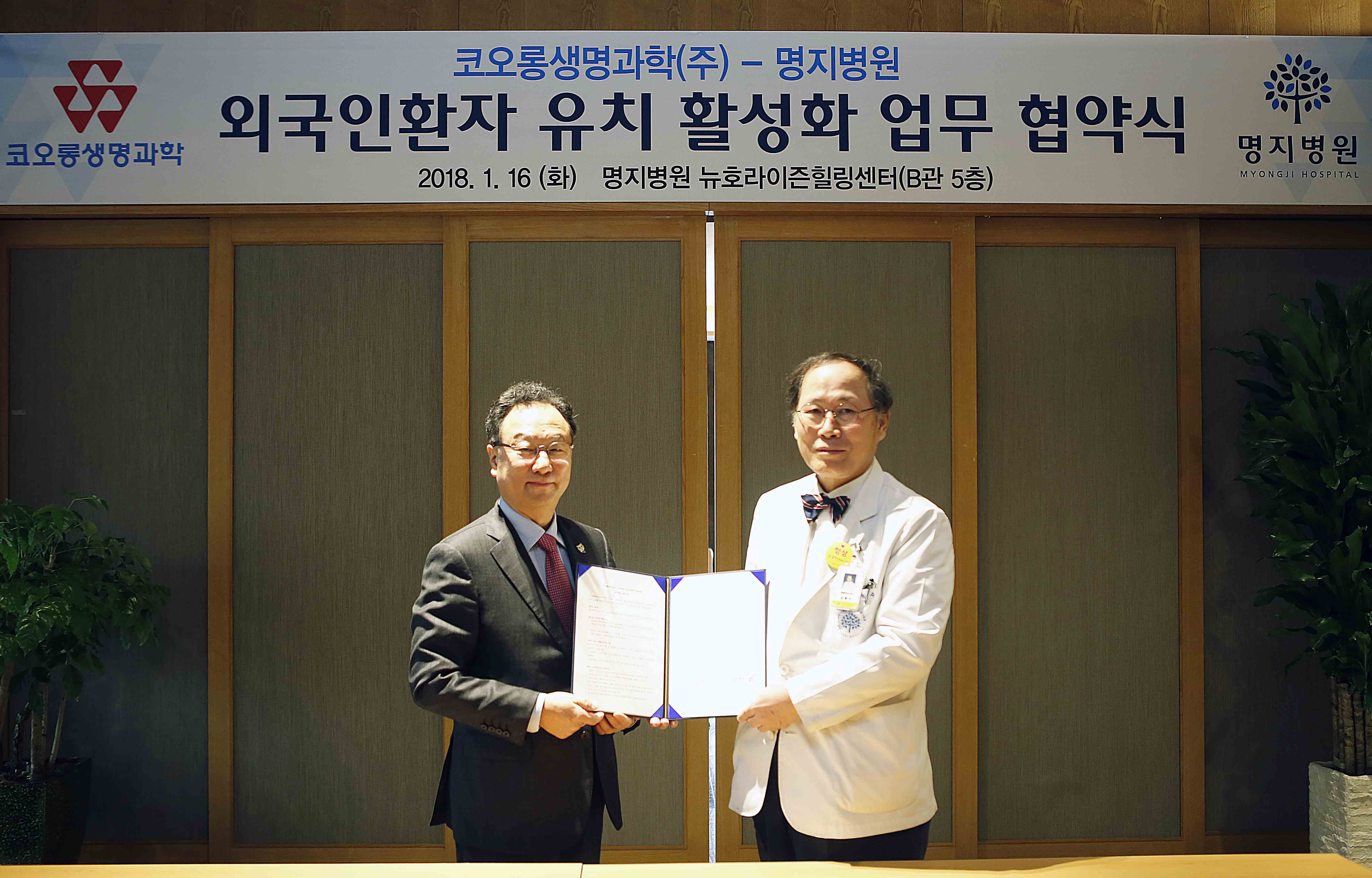 명지병원(병원장 김형수)과 코오롱생명과학(대표이사 이우석)은 지난 16일 오전 명지병원 뉴호라이즌힐링센터에서 외국인 환자 유치를 위한 전략적 MOU를 체결했다.