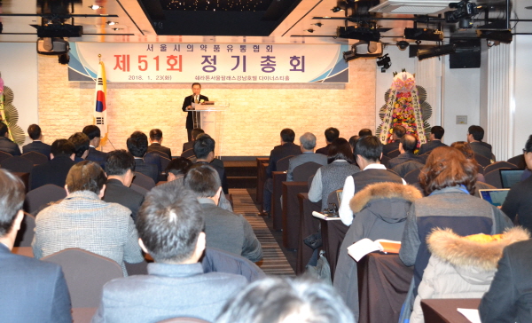 서울시의약품유통협회는 23일 쉐라톤 서울팔래스 강남호텔 다이너스티홀에서 제51회 정기총회를 개최하고 박호영 대표를 만장일치로 회장에 추대했다. 박호영 감사가 회장이 됨에 따라 공석이 된 감사에는 서울약업 주상수 대표가 선임됐다.