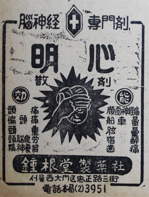 종근당제약사 명심. 이 제품은 건위정으로 두통 편두통 두중 뒤뇌피로 안면신경통 등에 효험이 있으며 심지어 숙취에도 좋은 효능을 보인다고 광고하고 있다. 상호가 종근당제약사로 되어 있으며 주소 또한 현재 종근당 본사사옥이 있는 서대문구 충정로 3가로 되어있다. 이 광고는 종근당의 초창기 제품광고로 더욱 의미가 크다고 할수 있겠다.