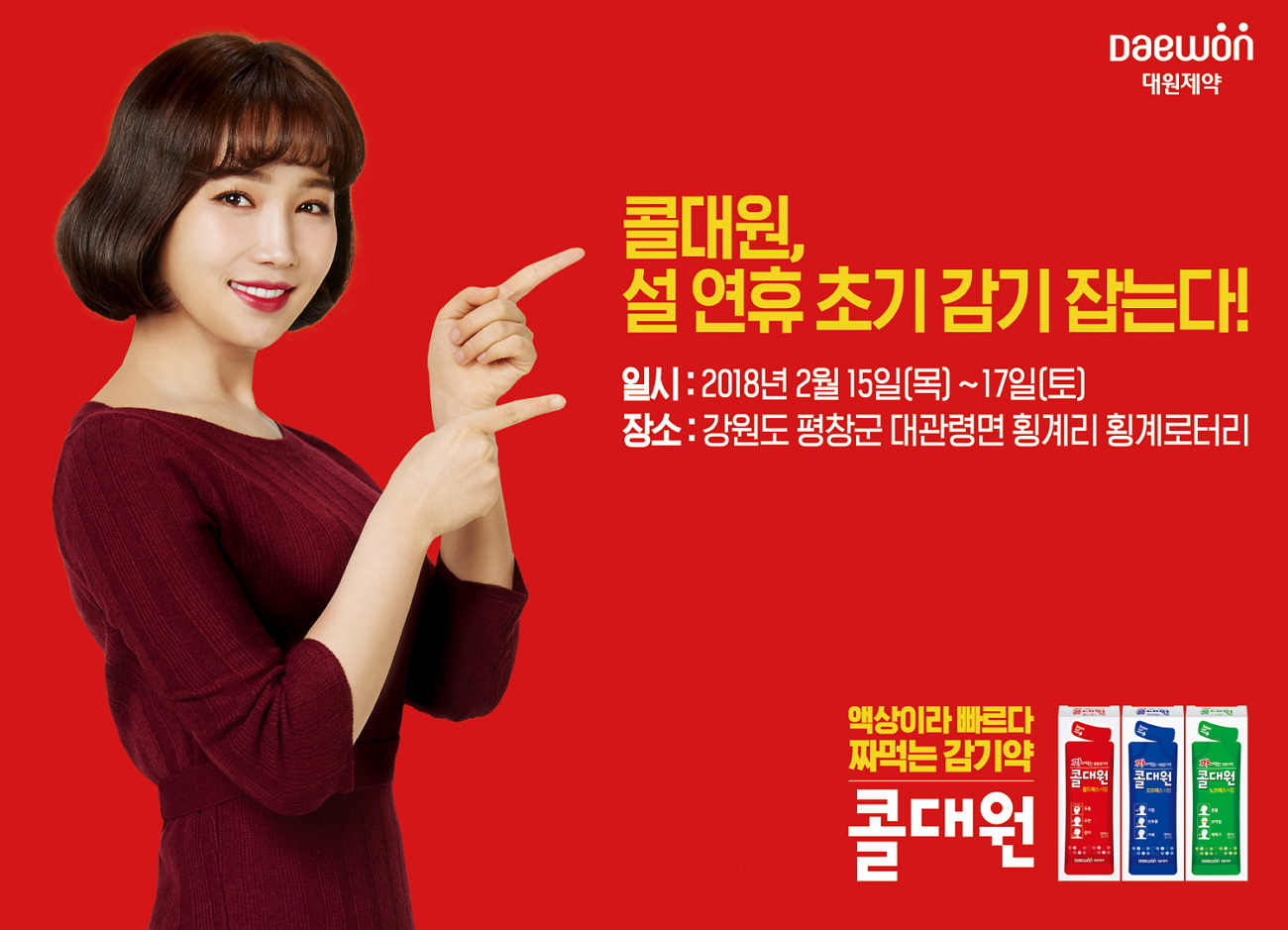 대원제약 헬스케어사업부 관계자는 “설 연휴 기간 동안 추운 날씨에도 불구하고 평창을 방문하는 소비자들에게 콜대원이 조금이나마 즐거움을 드리고자 이번 이벤트를 기획하게 되었다”며 “최근 계속되는 한파로 감기환자가 급증하고 있는 가운데 효과 빠른 짜먹는 감기약 콜대원으로 초기에 감기를 잡으시고 건강한 겨울 나시기를 바란다”고 말했다.