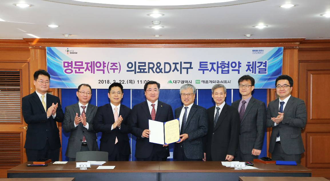 그동안 우수 제약기업 유치를 위해 적극적 투자 유치 활동을 지속해 온 대구시는 명문제약을 의료R&D지구에 유치하고 22일 오전 11시 시청 상황실에서 권영진 대구시장과 박춘식 대표가 참석한 가운데 투자협약을 체결했다.