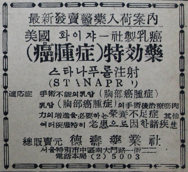 화이자 스타나푸롤 주사제 광고.  한국전쟁이 끝난후 1950년 중후반이후 의약전문지를 통해 많이 소개되던 외국산 수입의약품의 전형적인 광고 형태이다.  화이자가 발매한 스타나롤(STANAPR) 주사제를 소개하는 이 광고는 당시로서는 드문 항암제라는 점을 강조하고 있다.