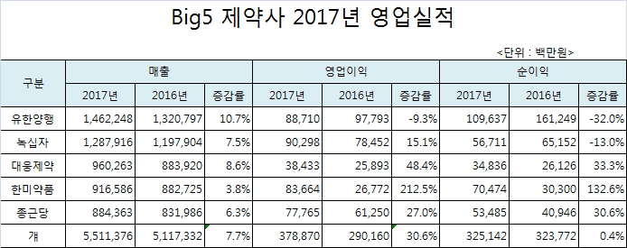 약업닷컴(www,yakup.com)이 제약업계 Big5 제약사(유한양행, 녹십자, 대웅제약, 한미약품 종근당)의 2017년 영업실적을 분석한 결과, 평균 매출 증가율은 8%, 영업이익은 평균 25% 증가, 순이익은 증감의 변화가 없는 것으로 분석됐다.