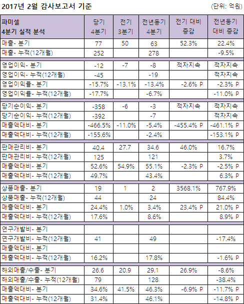 파미셀은 2017년 감사보고서 기준 지난해 전년 대비 9.5% 감소한 252억원의 매출을 달성했다.(4분기 77억원, 전년동기 대비 22.4% 증가)