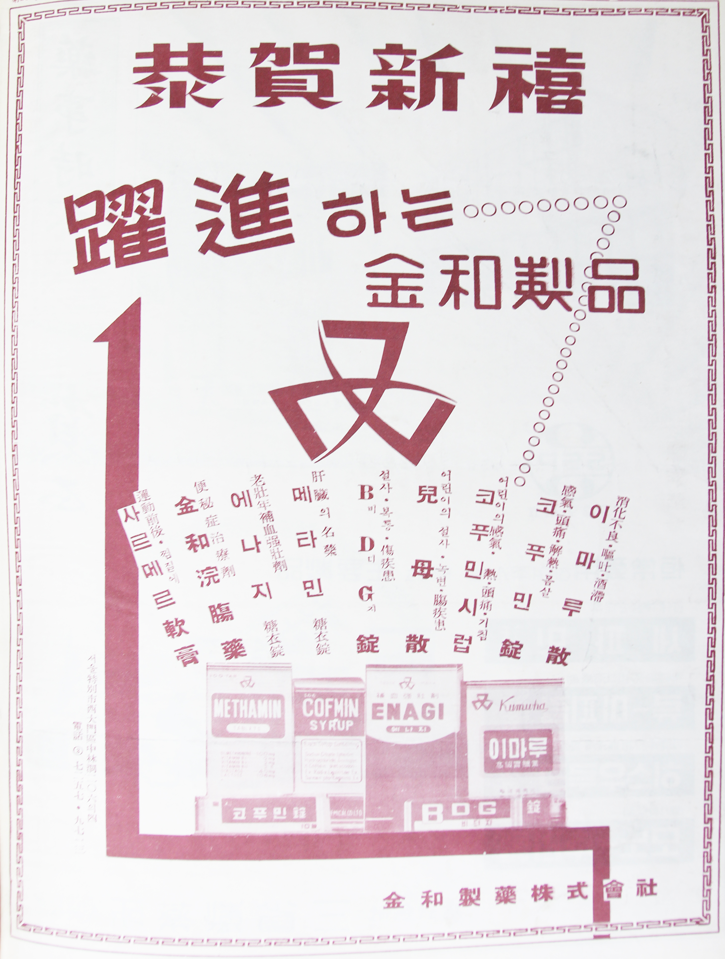 이 광고 상단에 표기된 경하신희는 '메리크리스마스 새해 복많이 받으세요'라는 의미의 연말연시를 전후한 중국식 인사말로 이 제품광고가 시중에 나온 시기를 짐작케한다. 광고제품중에는 이마루산, 코푸민정, 코푸민시럽 등 다양한 제형의 제품이 동시에 소개되는 등 당시 금화제약의 제품력을 엿보게 한다.