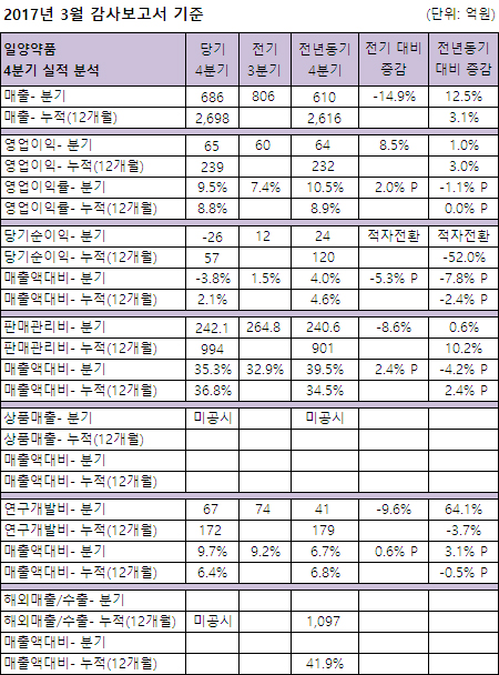 일양약품은 3월 감사보고서 기준 지난해 2,698억원의 매출을 달성, 전년동기대비 3.1% 성장했다.