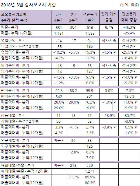 코오롱생명과학은 3월 감사보고서 기준 지난해 1,181억원의 매출을 달성, 전년동기대비 25.4% 감소했다.