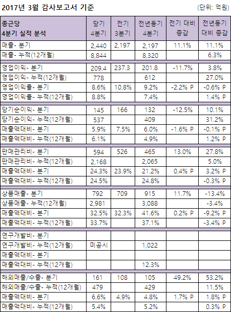 판관비는 2,168억으로 5.0% 늘었고 상품매출은 2,981억으로 3.4% 줄었다.